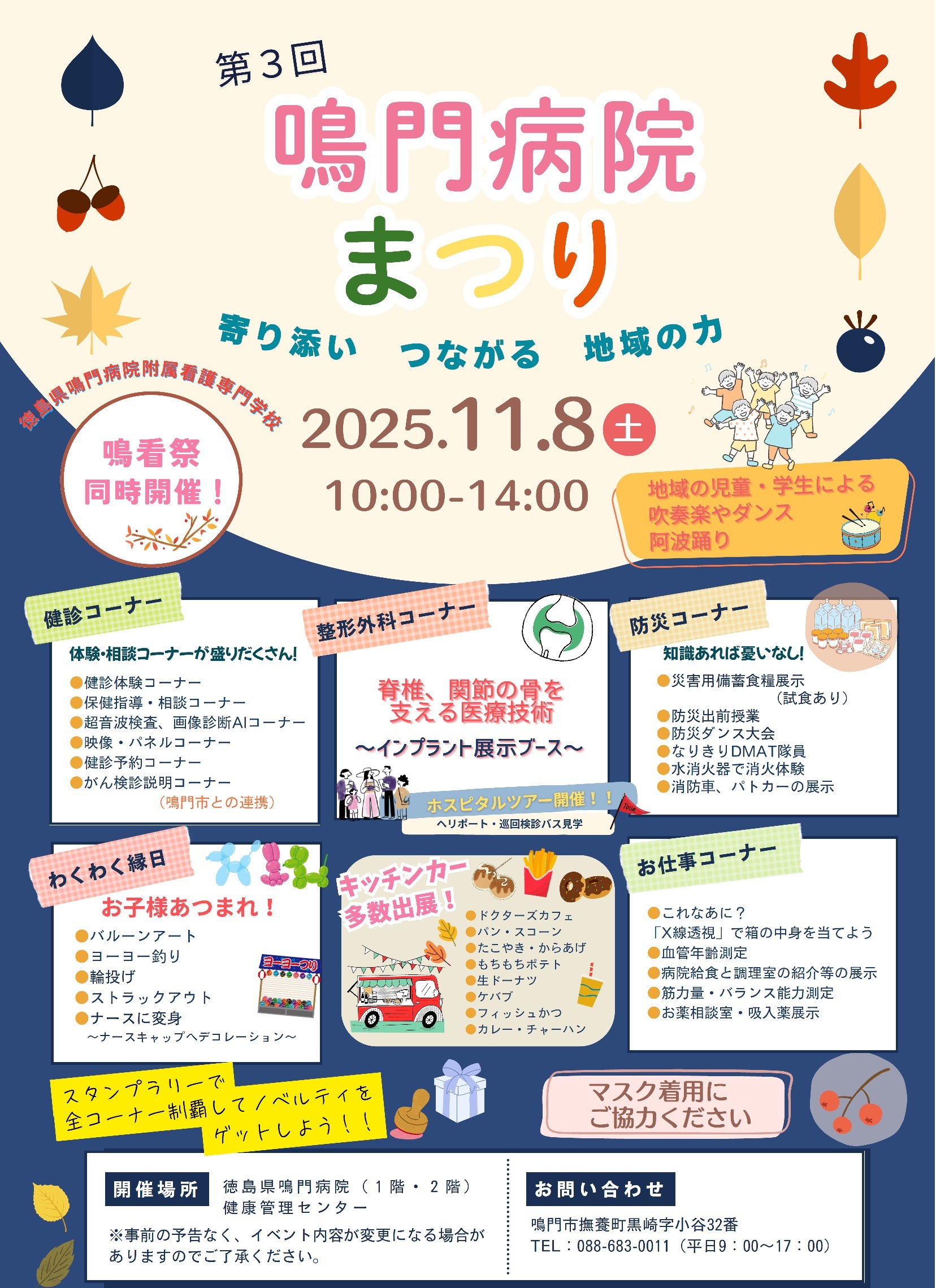 当院では、『寄り添い、つながる、地域の力』をテーマに、第3回鳴門病院まつりを開催いたします。