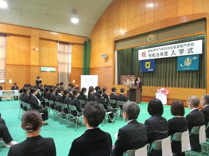 令和8年4月9日に、第16期生の入学式が行われ、新入生33名は、看護職への希望を胸に、新たな一歩を踏み出しました。第16期生代表、川原虹雪さんが、「看護学生としての誇りを持ち学業に励み、専門職となることを、お誓い致します。」と誓いを述べました。また、住友理事長より、新入生の代表に花束が贈呈され、あたたかい励ましのお言葉が、贈られました。